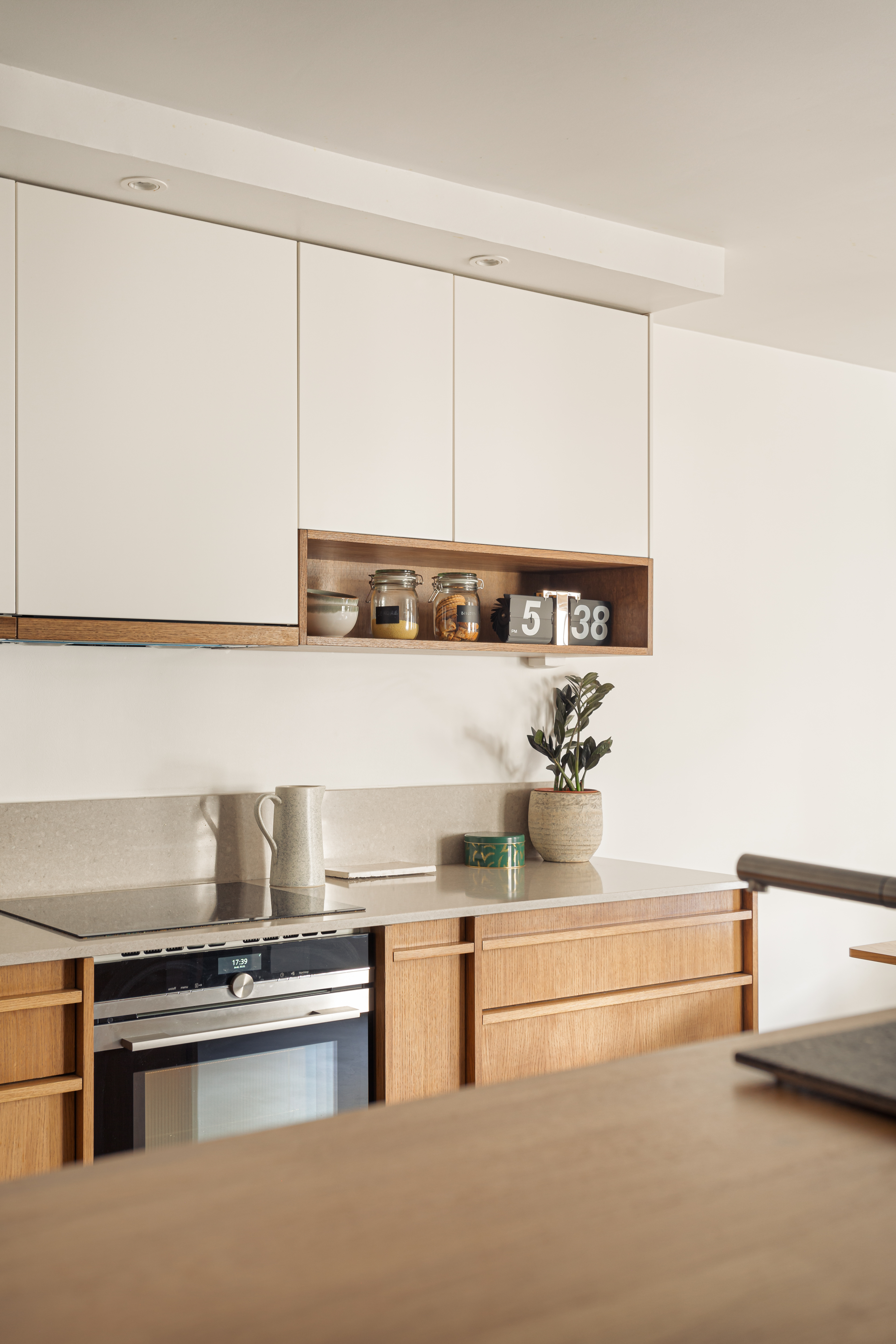 Grand appartement de 74m² avec une grande chambre et une très grande pièce de vie autour d'une cuisine ouverte. La pièce de vie se cloisonne à l'aide de grandes parois en bois en accordéon pour former une deuxième chambre ou un bureau fermé.